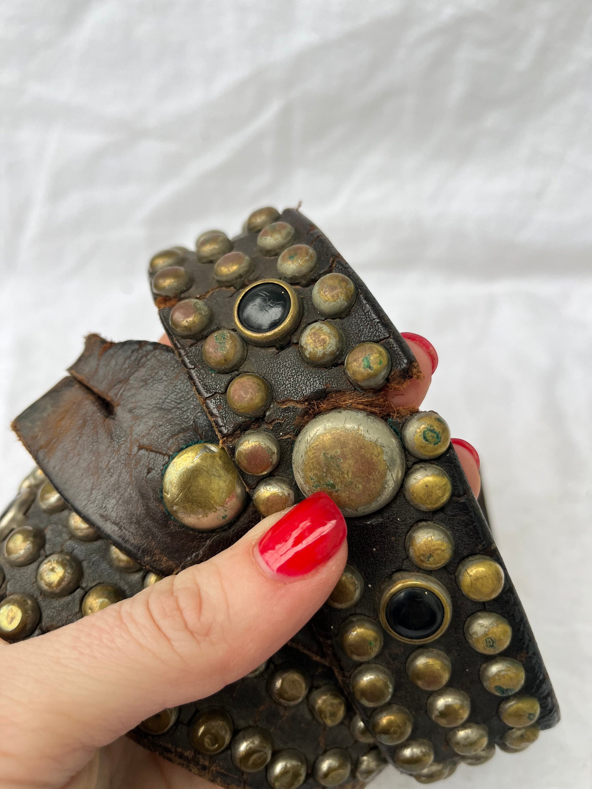 Studs are missing, leather needs reinforced and there is so buckle. Could remove studs to make smaller, right now works for 30”-32”. See all flaws shown.