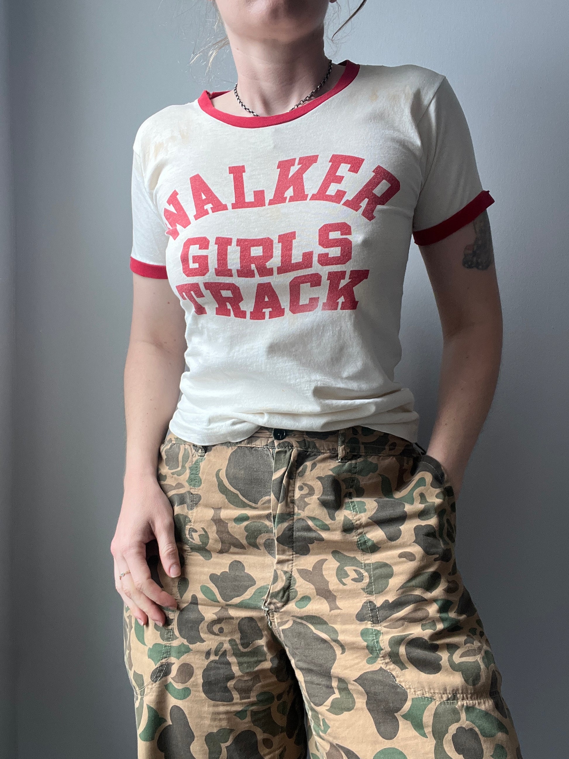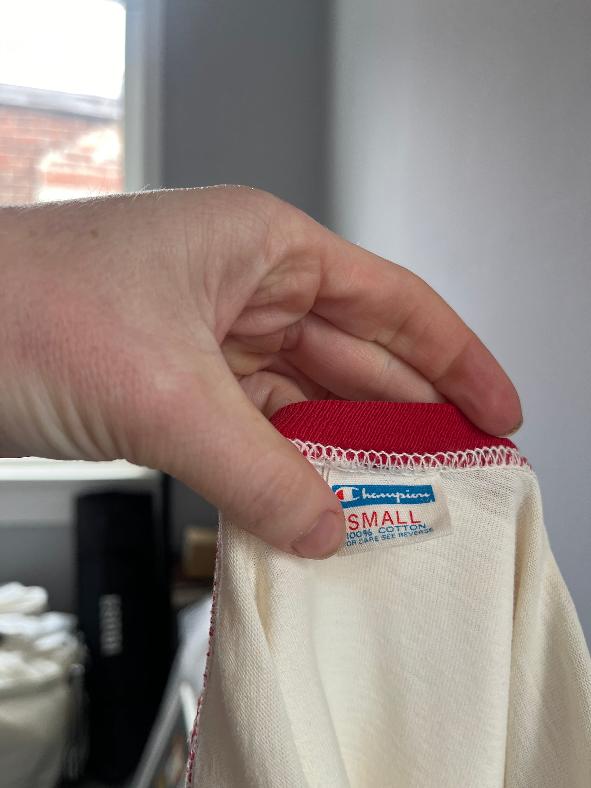 Great font on this one. Has some minor discoloring but not major. Really great graphic tee that's perfect with any outfit. Fits XS/S, 15.5" pit to pit by 25" top to bottom.