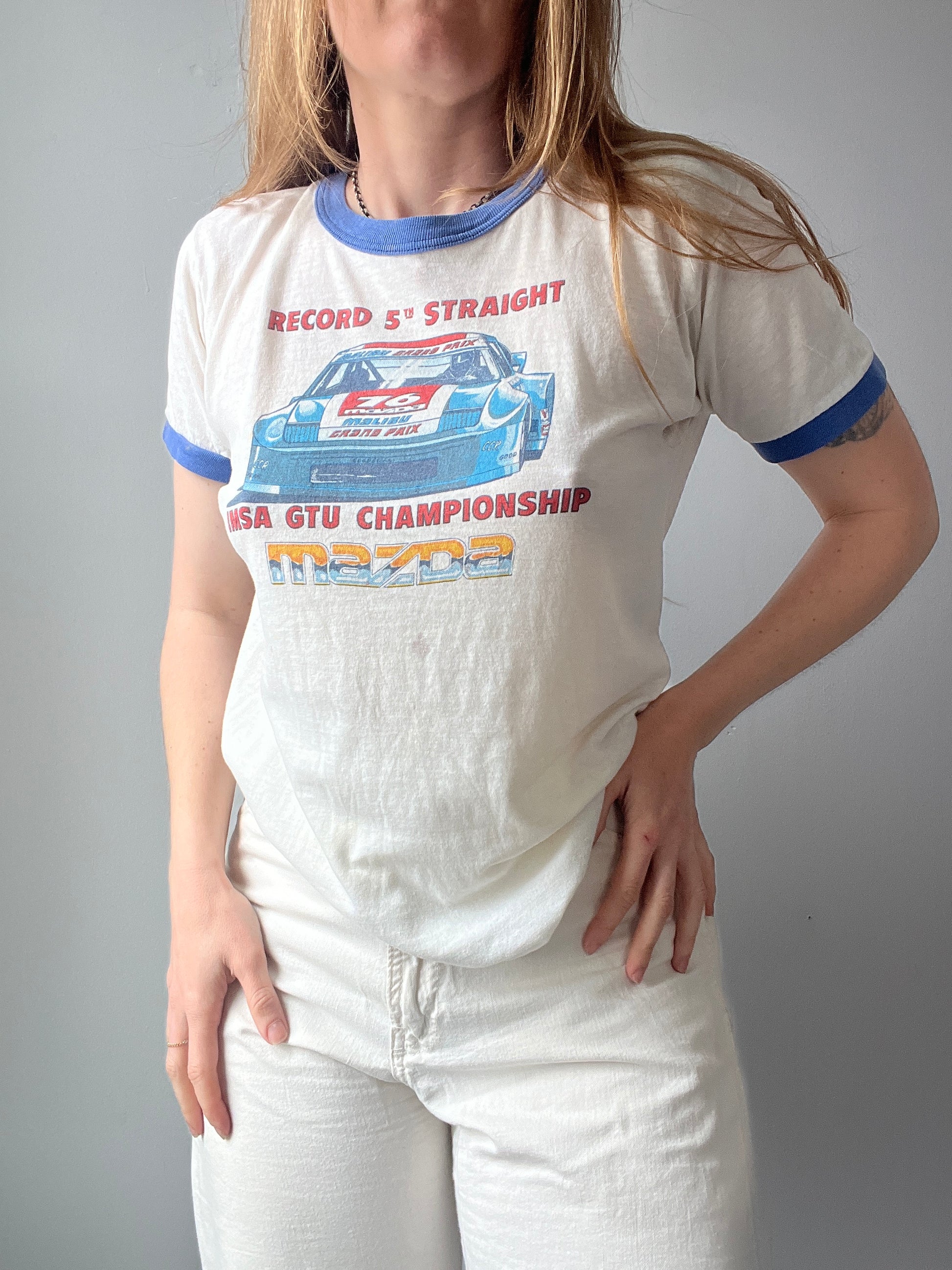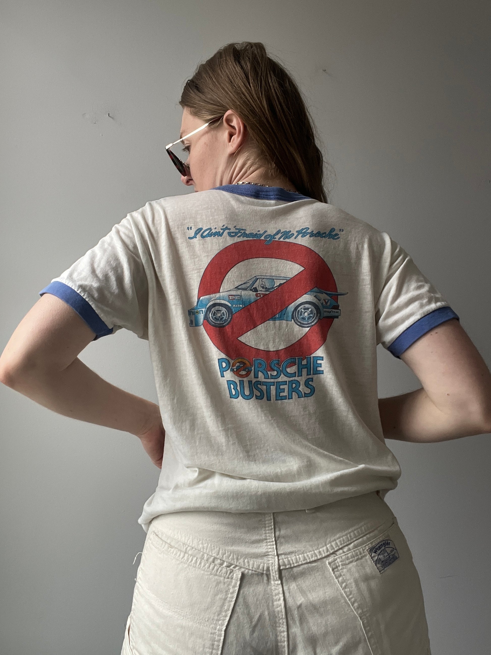 Killer graphic on this one! Back hit says "I Aint 'Fraid Of No Porsche" - kind of iconic. I hardly come across vintage Mazda tees. This fits S-L, 20" pit to pit by 25" top to bottom. Super thin and soft.