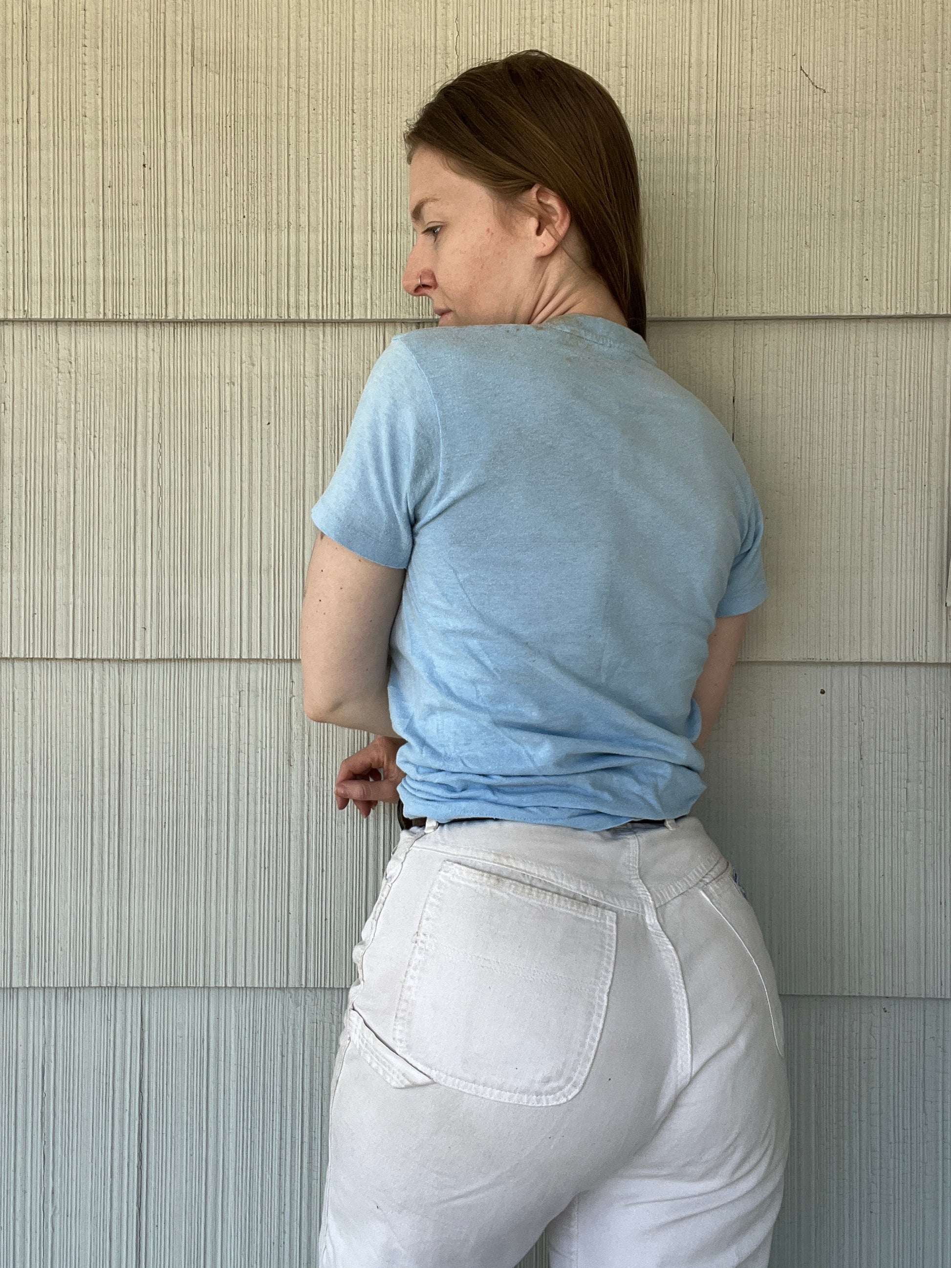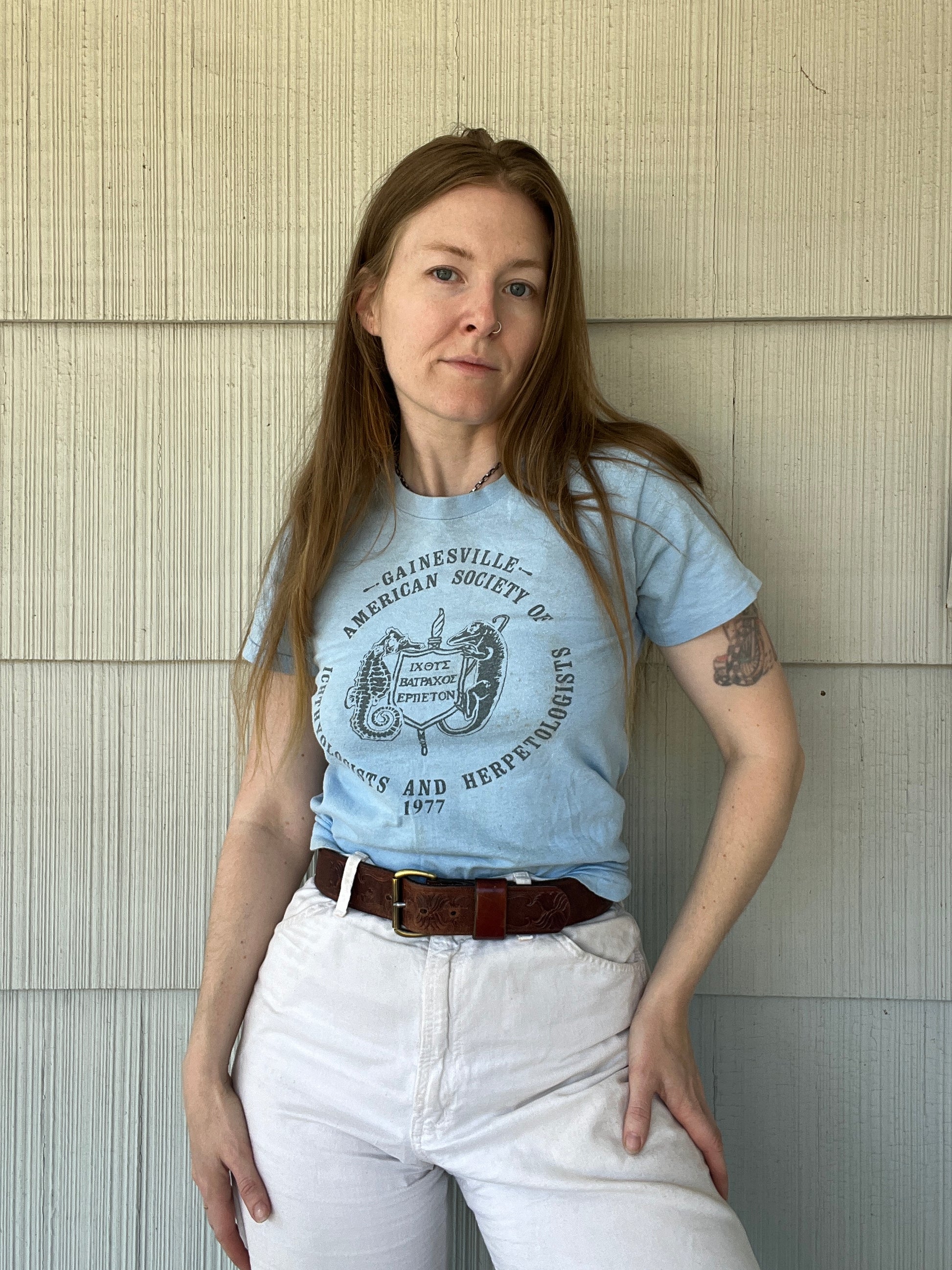 Really killer shirt from the 70s. Some flaws but nothing major. Works for S/M, 18” by 23”.