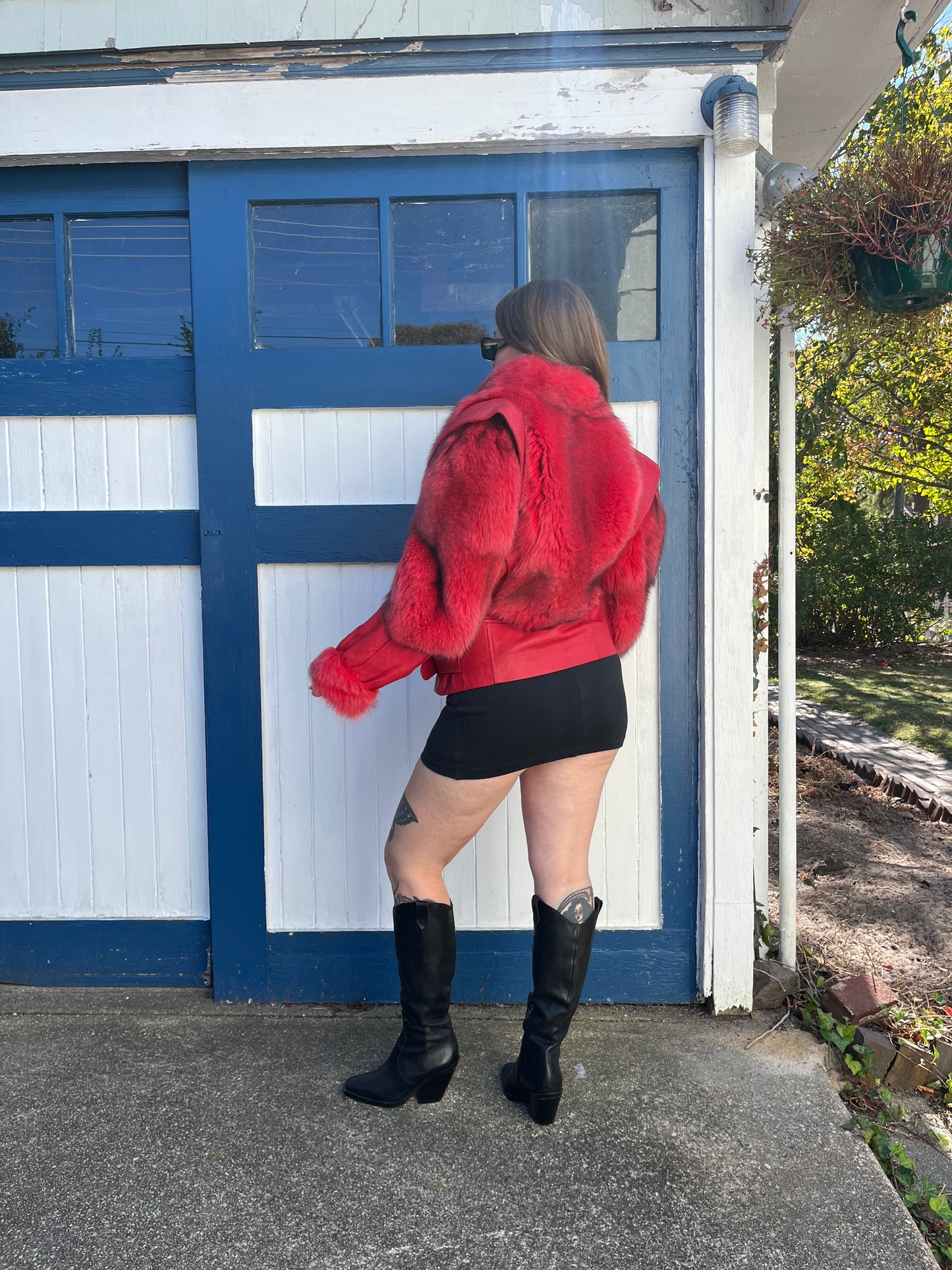 1980s fox fur & leather bright pinkish red fur coat. absolutely stunning. such a beautiful silhouette on this one! no flaws to mention. works for XS-L depending on fit - seen on 5’5 model who is usually a S or M in jackets. up to 44” bust, 25” length, 21” shoulder 23” sleeve length