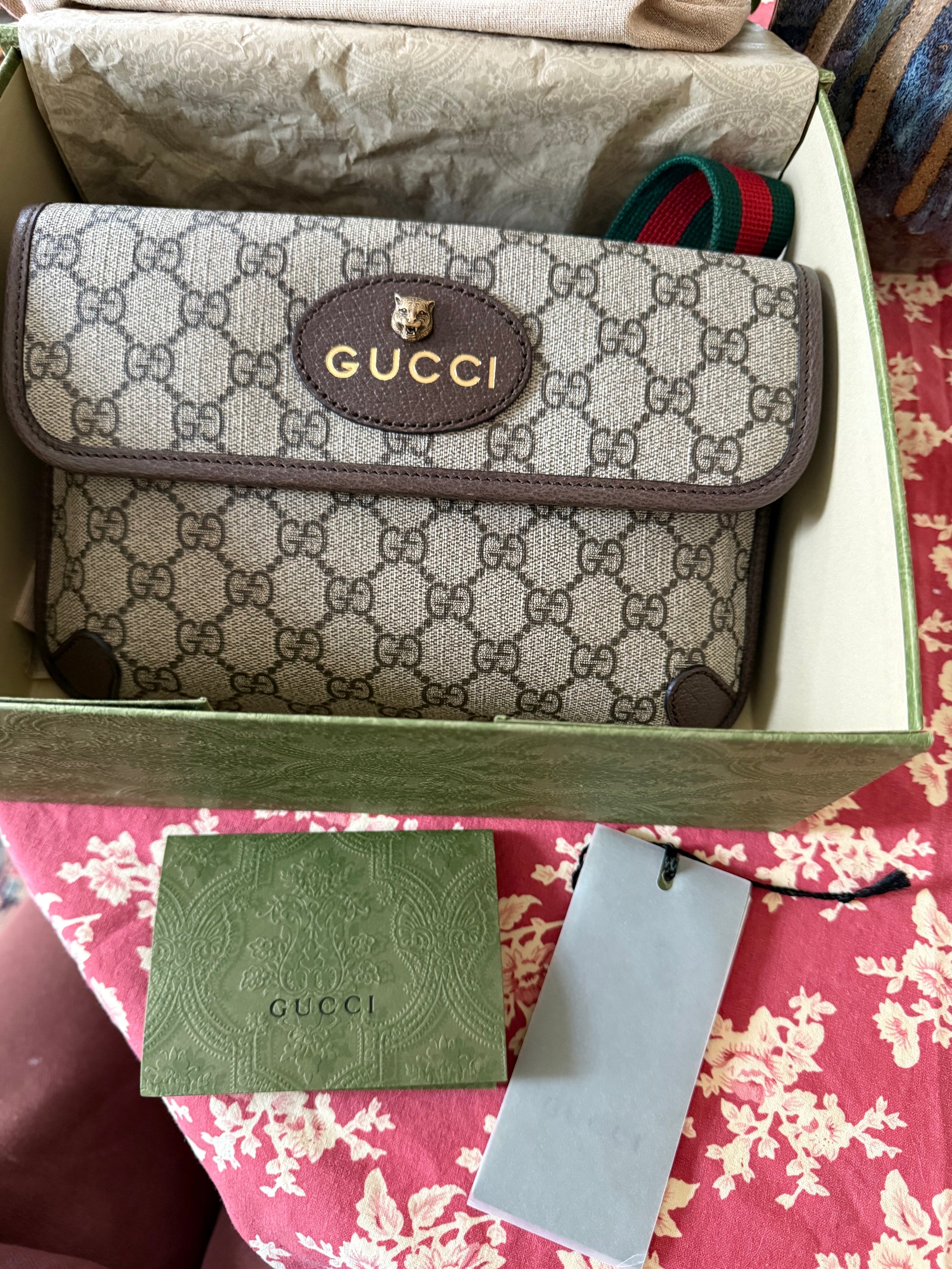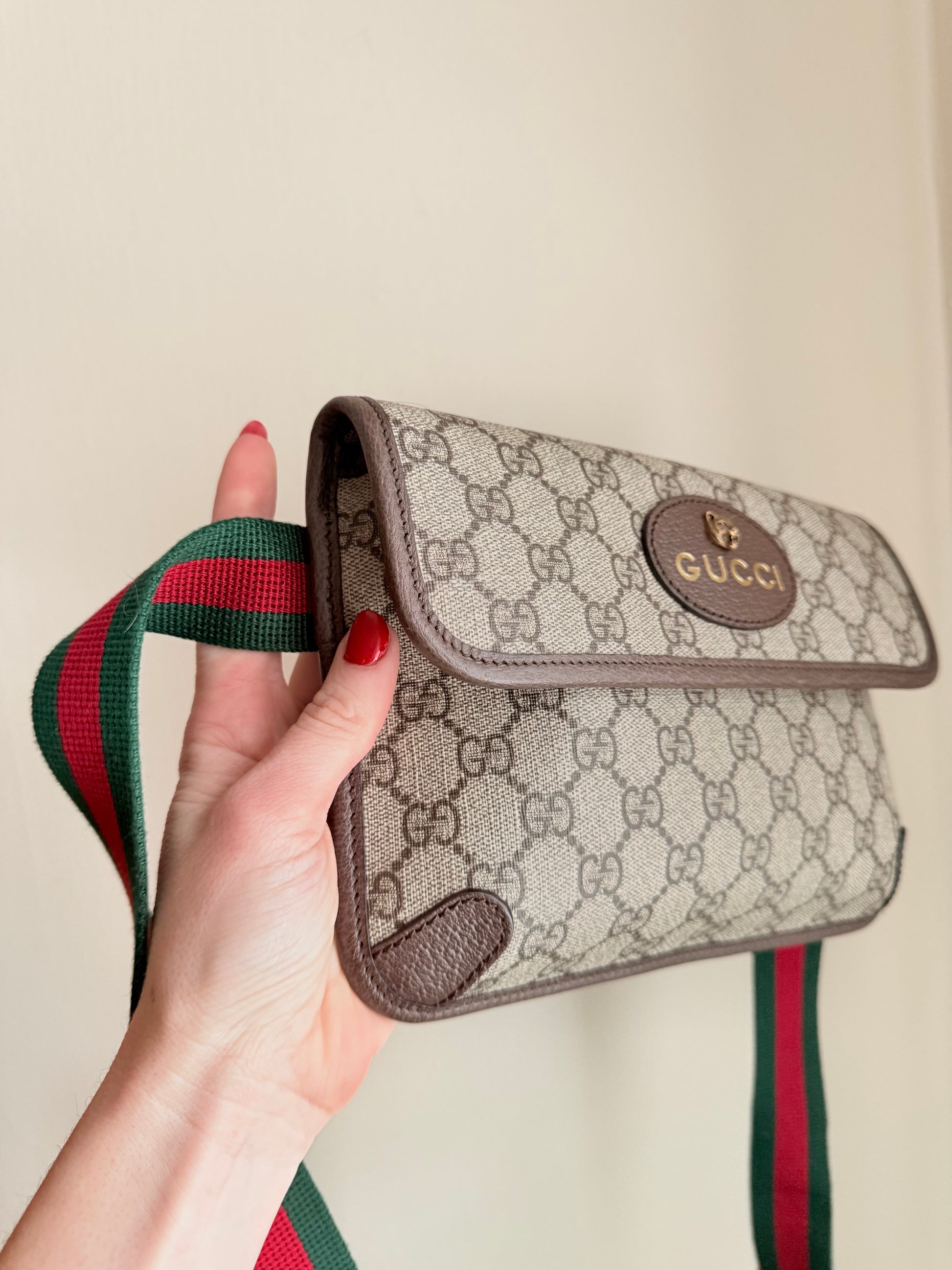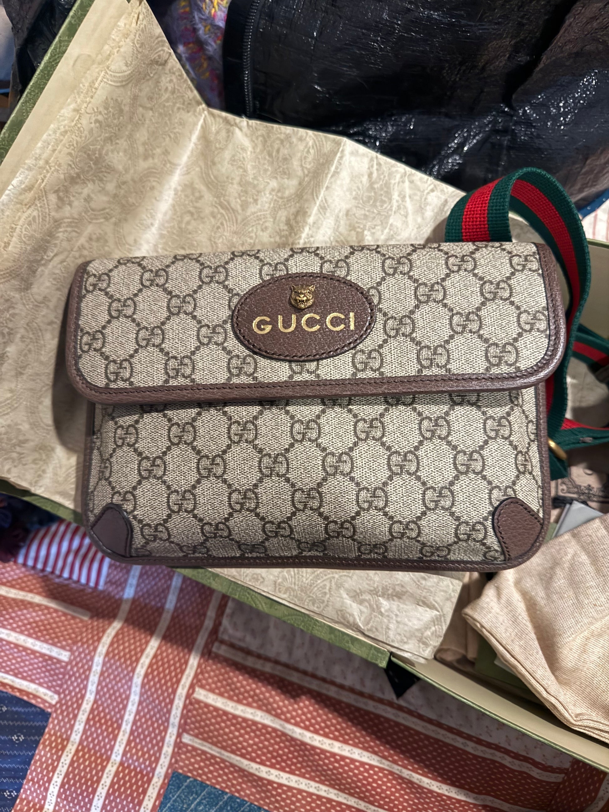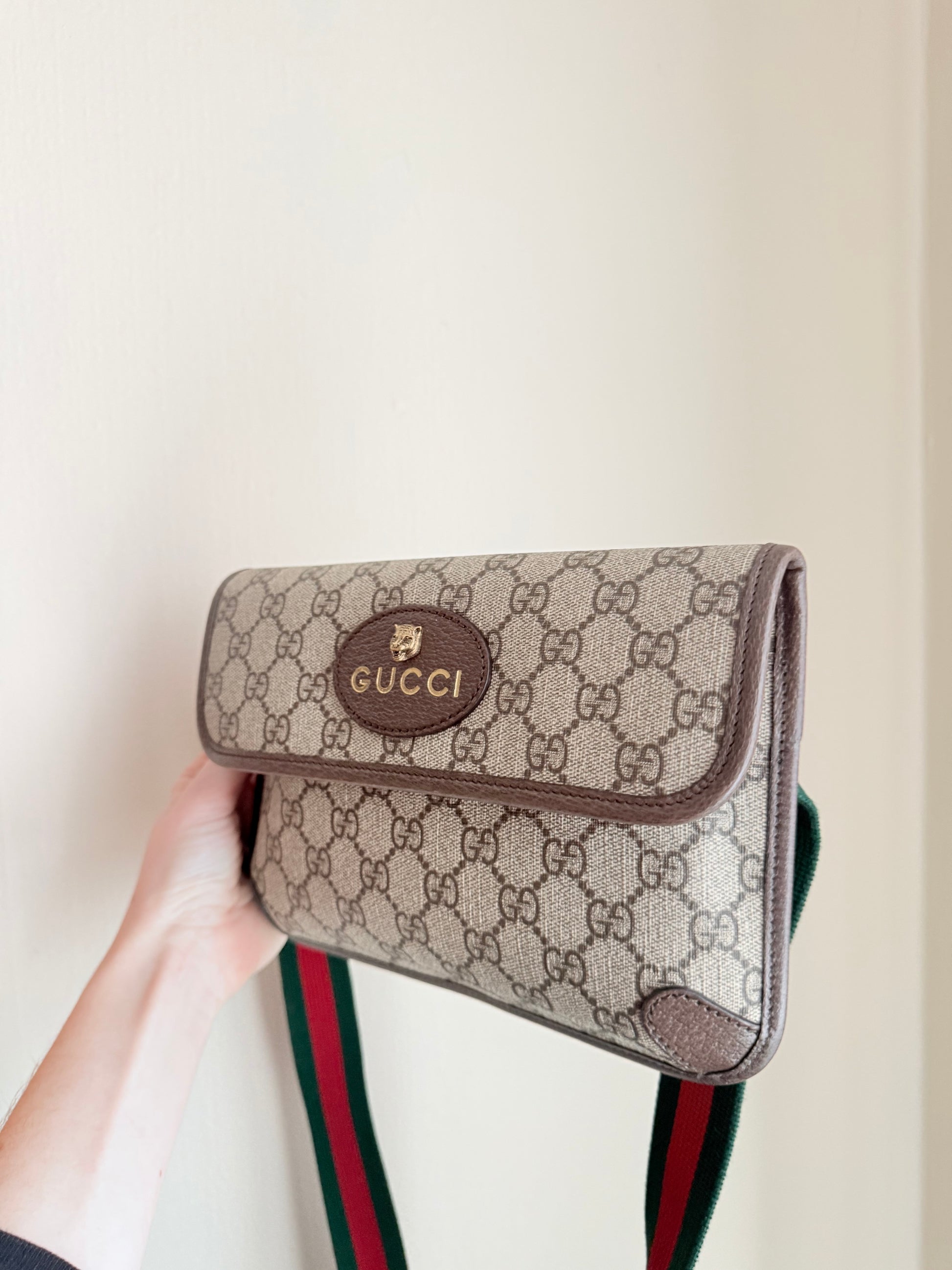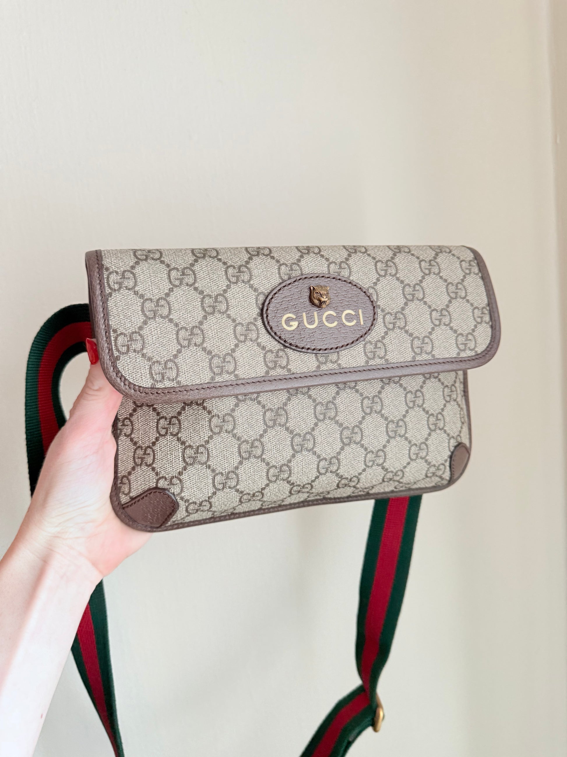 This pre-owned Neo Vintage belt bag is crafted in GG Supreme coated canvas with brown leather trim. It is accented with gold-tone tiger head hardware and logo foil stamping on the front. The bag includes Gucci's signature red and green Web canvas waist belt. Gucci's Neo Vintage collection features classic logo prints combined with contrasting colorful straps, inspired by the vintage Gucci pieces artisans would repair using any materials available.