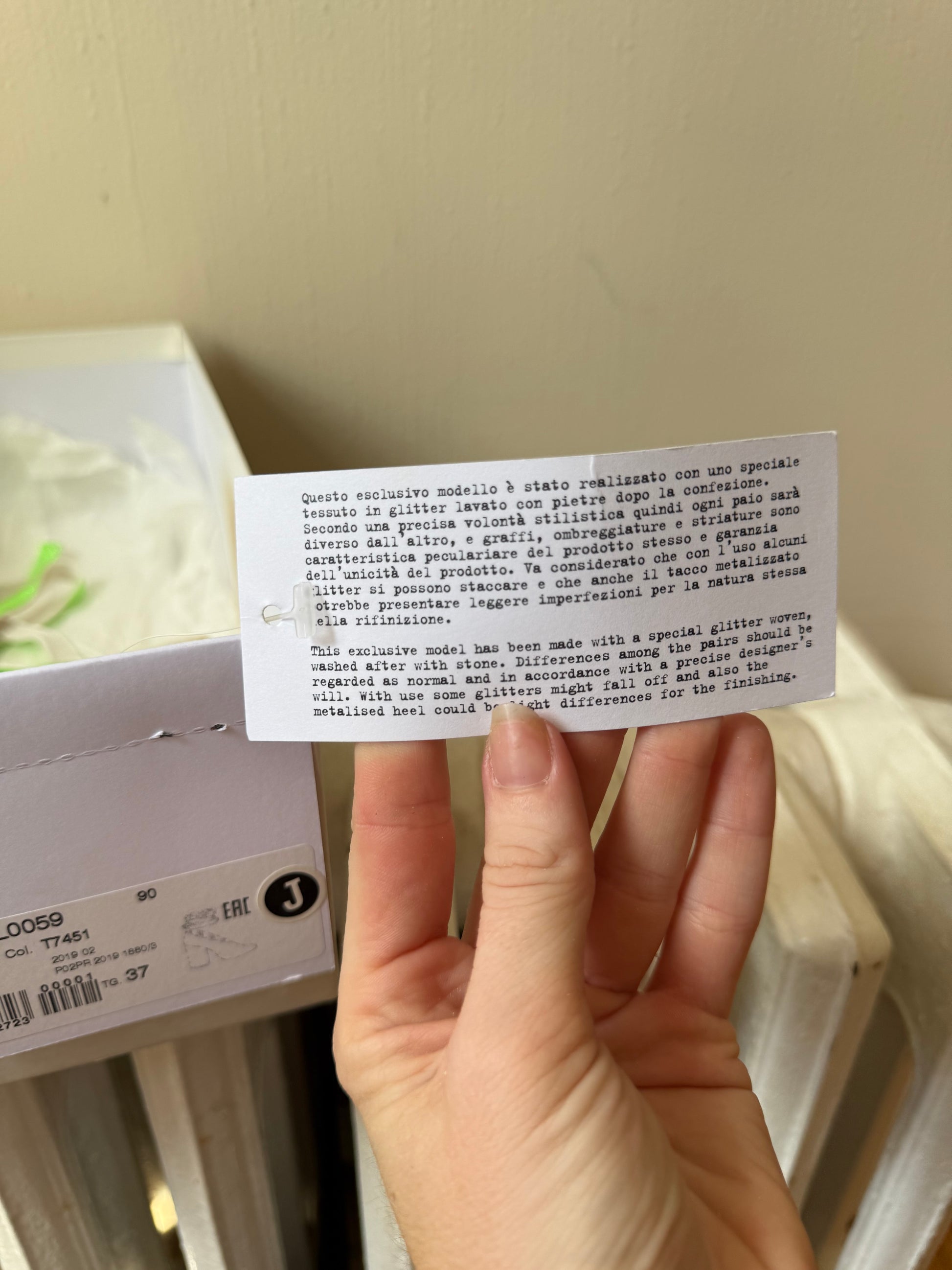 Marked sized 37. Some of the sparkles do flake off as shown on the tag created by Maison Margiela indicating that is normal. No major flaws. Comfortable. Very cool and rare shoe! Comes with box & dust bags.
