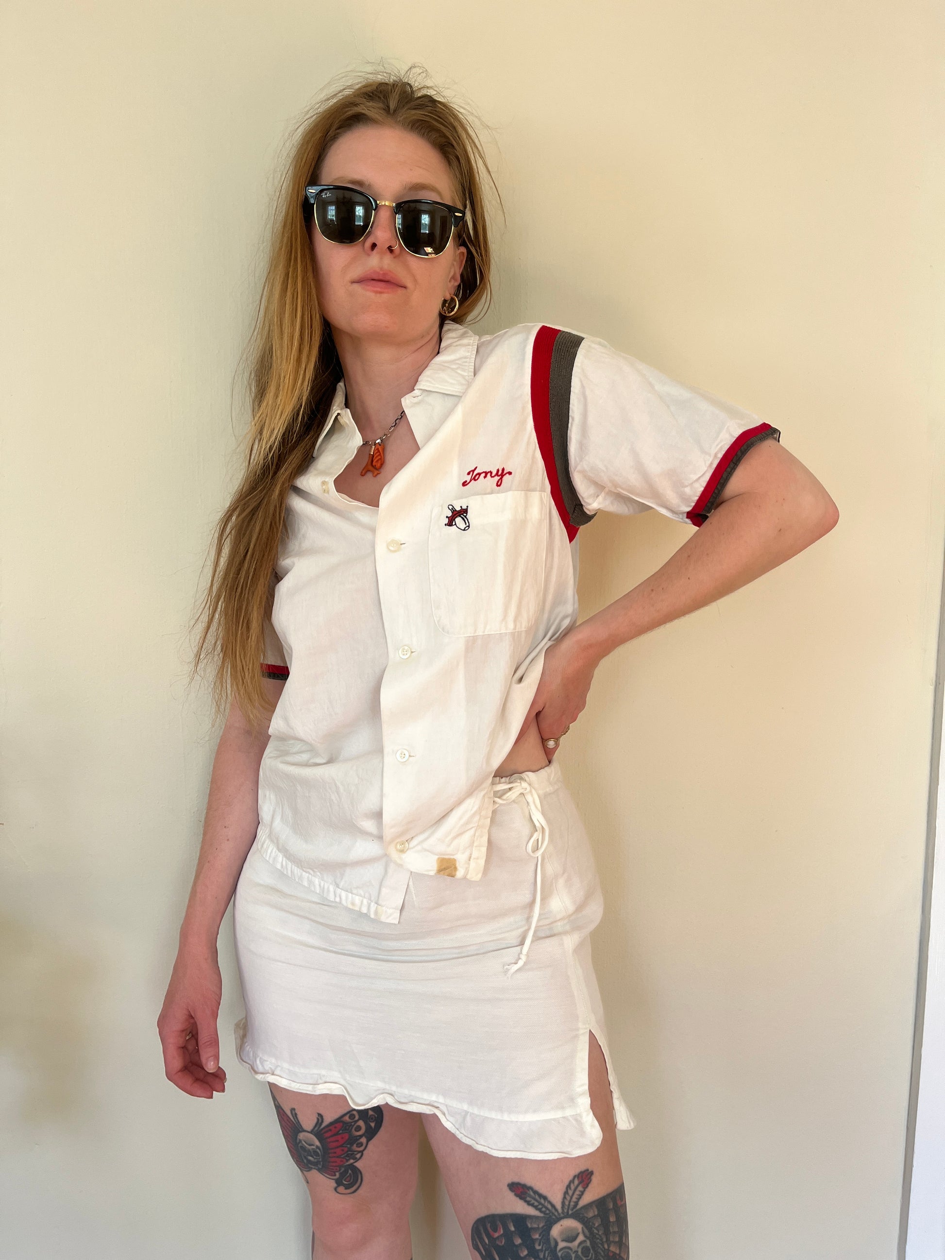 Extremely fun bowling tee. Really great chain stitching on back. Has one stained area towards bottom front of top as shown, I have not tried to lift. Works for S/M.