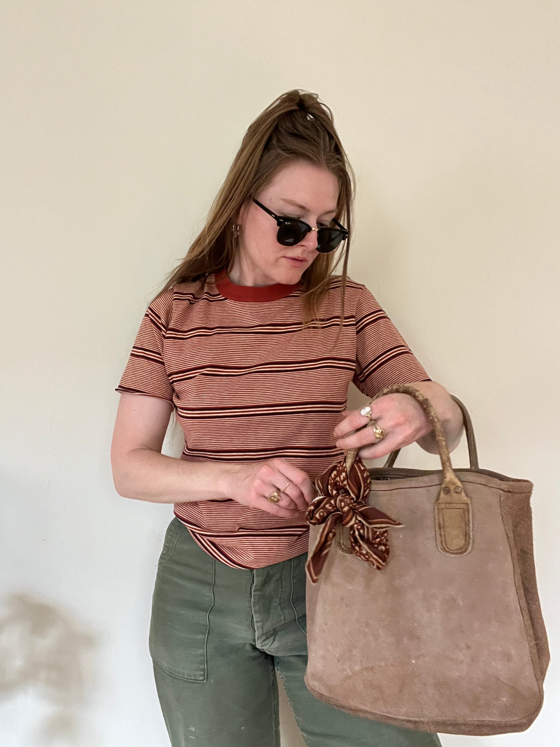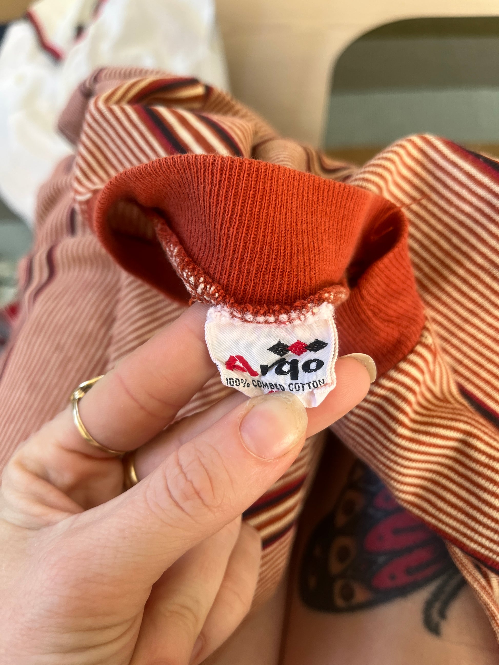 100% cotton baby. Super comfy and lightweight. No major stains to note. Works for S/M.