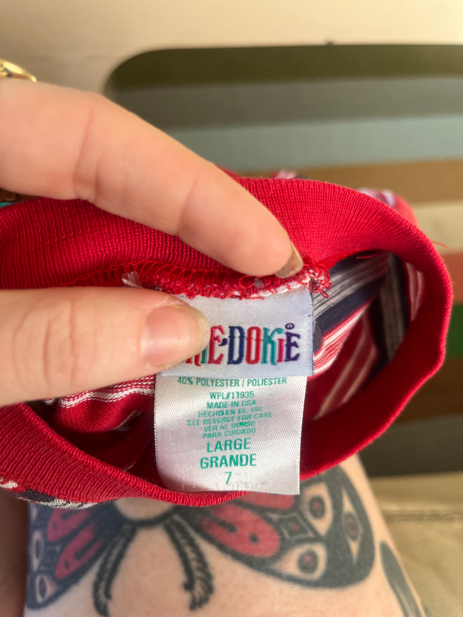 Extremely cute with great primary colors. Made in USA. Cotton/Poly blend. No flaws to mention. 15" pit to pit with stretch and 18" top to bottom. Best for XS/S.